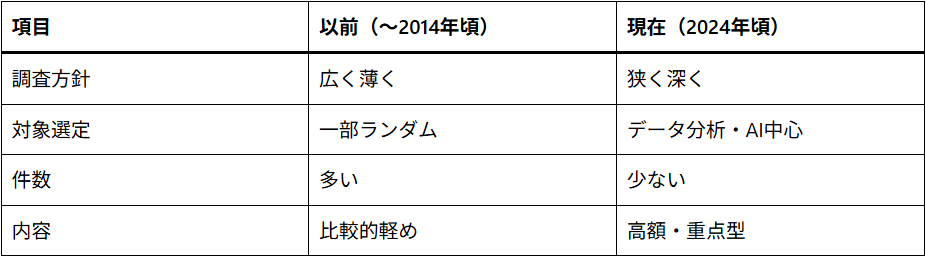 現在は、データ分析などをもとに「調査の必要性が高い」と判断された対象に絞って調査が行われる傾向があります。